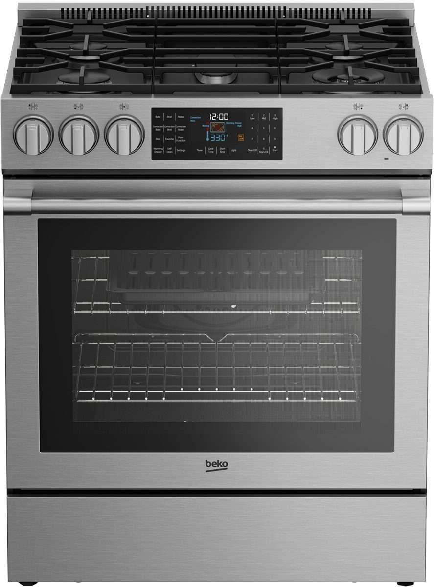 Complete your home kitchen system with the Beko 30" Stainless Steel Slide In Gas Range featuring LED display with InnovaChef Smart display, full lower extension telescopic rack, and 4 pane heat-resistant glass door cooling system.Read More